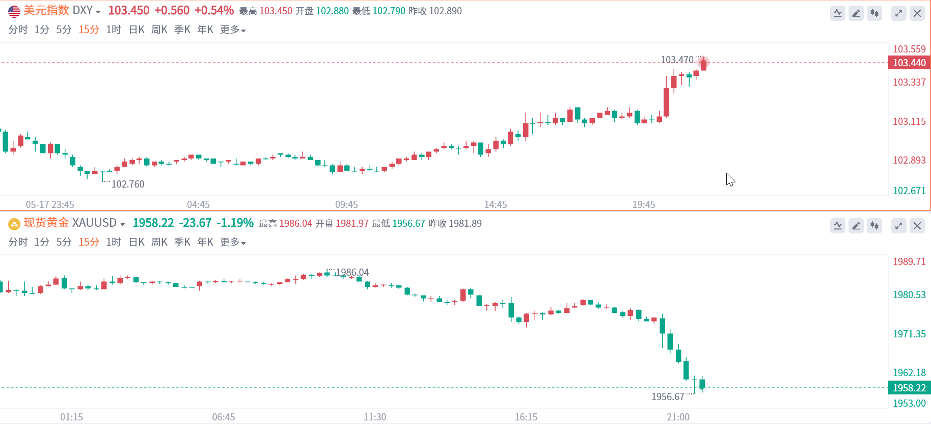 数据公布后,美元指数不断走高,日内涨幅达0.5%;非美货币普遍受挫;现货黄金持续下探,跌破1960美元/盎司,日内跌超1%。美、布两油也转跌,跌幅超过1%。