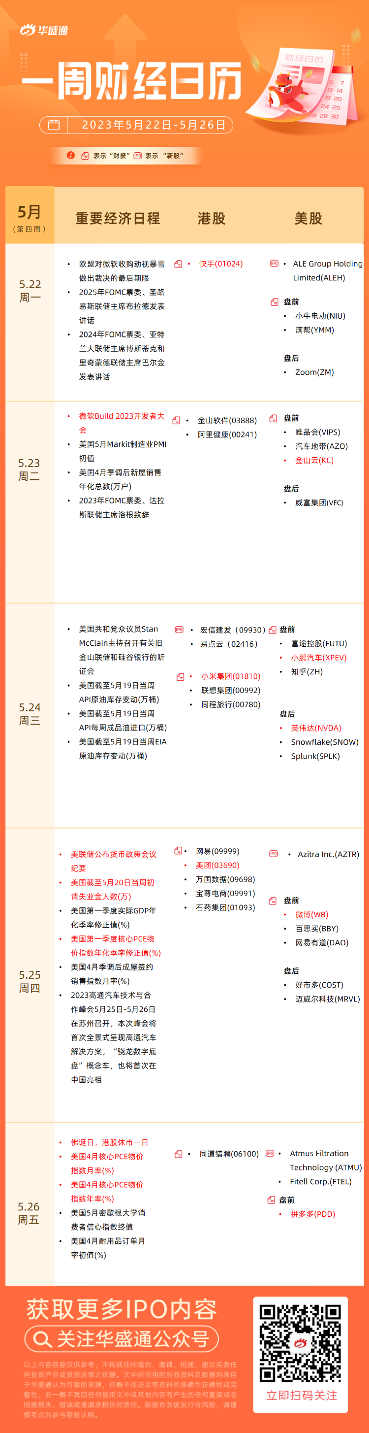 港股方面,本周预计有两只新股上市,设备运营服务提供商宏信建发( $09930.HK )于5月24日正式挂牌交易。公司是中国领先设备运营服务提供商之一,公司的收入由2020年的36.64亿元增至2022年的78.78亿元,复合年增长率为46.6%。