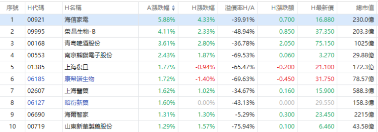 截至发稿,海信家电A股涨5.88%,H股现涨4.33%;荣昌生物A股涨4.11%,H股现涨2.33%;青岛啤酒股份A股涨3.61%,H股现涨2.80%。