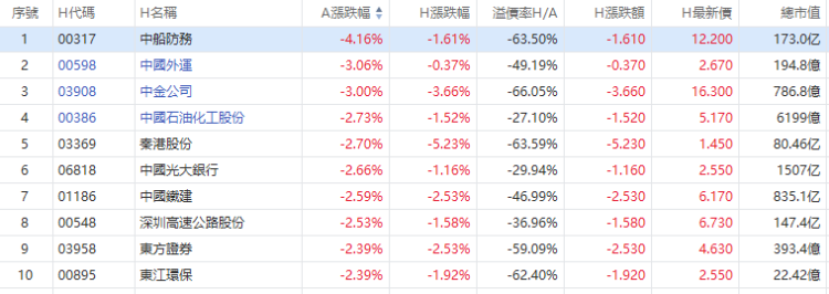 中防船务A股跌4.16%,H股现跌1.61%;中国外运A股跌3.06%,H股现跌0.37%;中金公司A股跌3%,H股现跌3.66%。