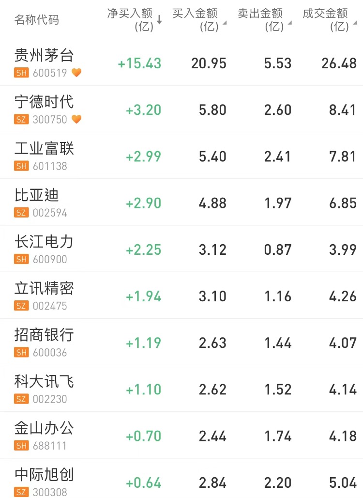 北上资金今日净买入A股41.32亿元,终结此前连续2日净卖出态势。贵州茅台、宁德时代、工业富联分别获净买入15.43亿元、3.2亿元、2.99亿元。隆基绿能和山西汾酒分别遭净卖出2.44亿元和2.29亿元。