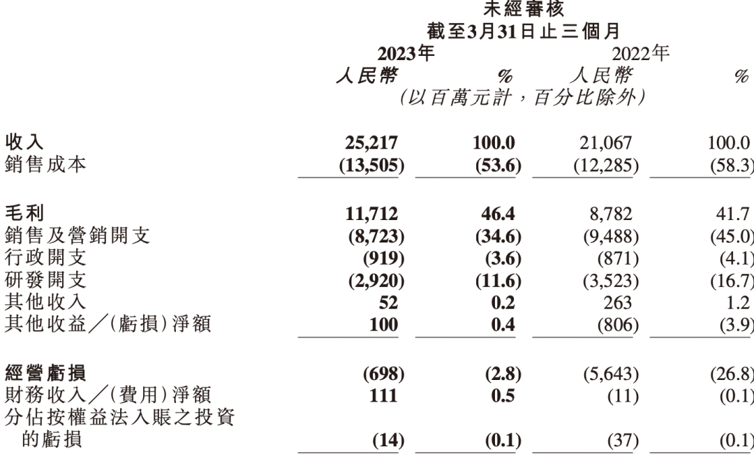 快手盈利能力大幅改善的背后,也离不开其一季度的降本增效策略。期间,快手的“销售及营销开支”砍掉了7.65亿元,其占总收入比例也由2022年一季度的45%减少至今年的34.6%。