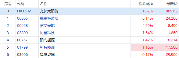 部分光伏股走高,截至发稿福莱特玻璃(06865)现上涨6.14%,报24.2港元,信义光能涨超4%,协鑫科技、阳光能源涨超1%。