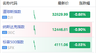 华盛资讯5月24日消息,美股三大指数集体走弱,截至发稿,道指跌0.68%,纳指跌0.90%,标普500指数跌0.83%。