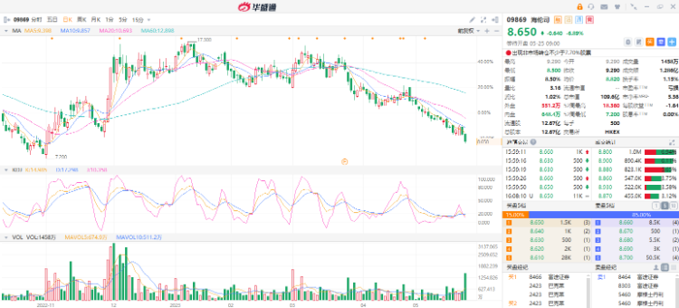 5月24日,海伦司股价一度下探至8.5港元,创年内新低。收盘报于8.65港元,年内跌幅达到41.63%,较25.75港元的历史高点,跌幅高达66.41%。