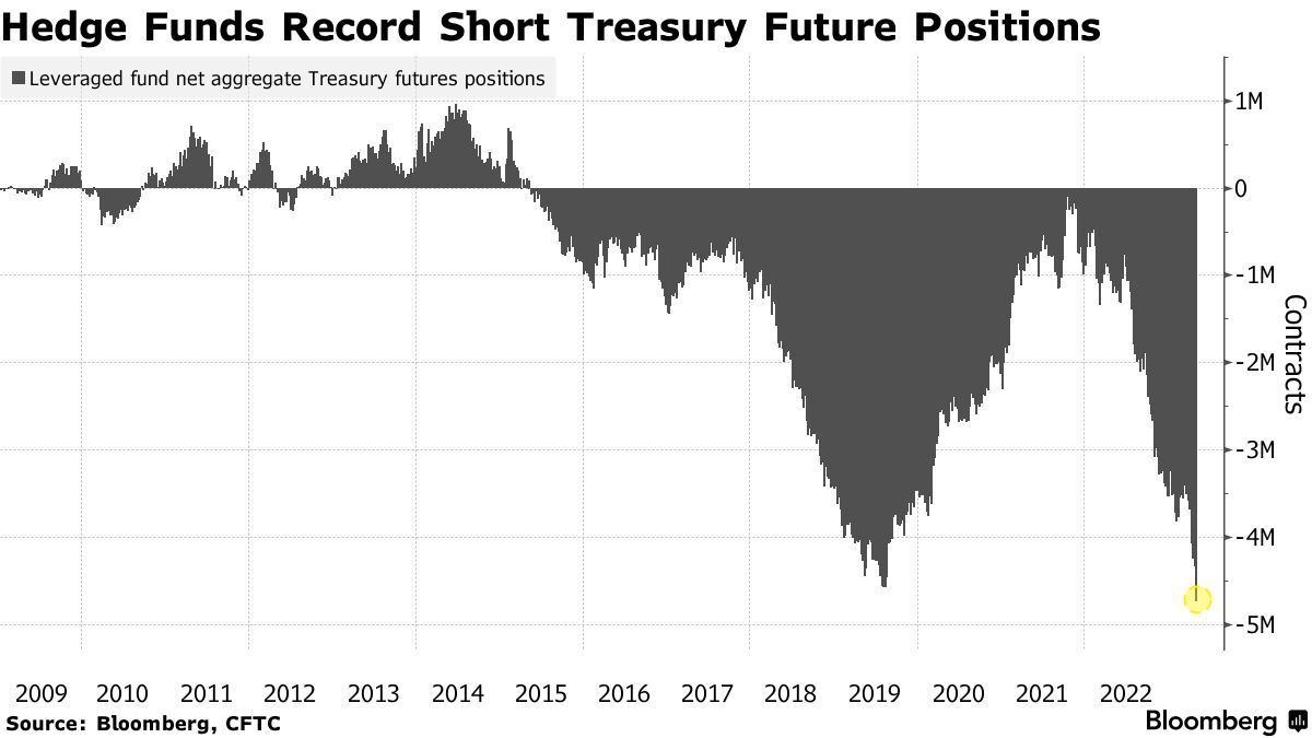 根据美国商品期货交易委员会(CFTC)的最新统计数据,杠杆型对冲基金在截至5月初的一周内,将美国国债期货的整体空头比例推高至创纪录的历史高位。同时这也是对冲基金连续七周对美债的看空押注增加——该项数据创下自2017年以来的最长纪录。