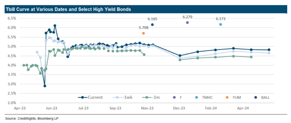 国库券的收益率与包装公司Ball Corp.发行的垃圾级债券(2023年11月15日到期)或住宅建筑商Taylor Morrison Communities Inc.出售的债券(2024年3月1日到期)的收益率接近。这些公司的评级为BB+,完全属于垃圾级或“投机”级债券。