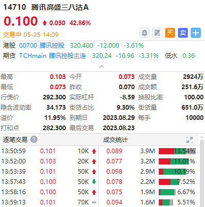 腾讯沽14710,行使价292.3港元,2023年08月29日到期,实际杠杆9倍,行使价280港元以上、3个月期以上最高杠杆之一;