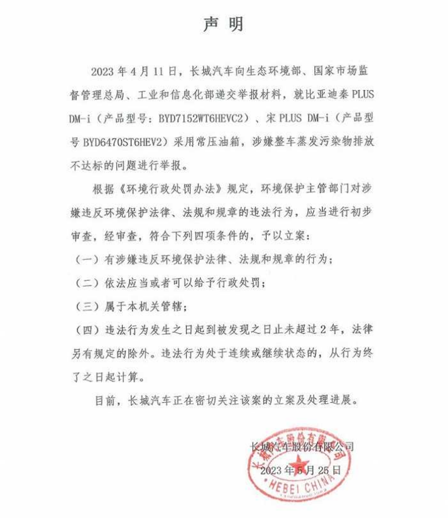 长城汽车声明称,已于今年4月11日向生态环境部、国家市场监督管理总局、工业和信息化部递交了举报材料,就比亚迪秦PLUS DM-i、宋PLUS DM-i采用常压油箱,涉嫌整车蒸发污染物排放不达标的问题进行举报。