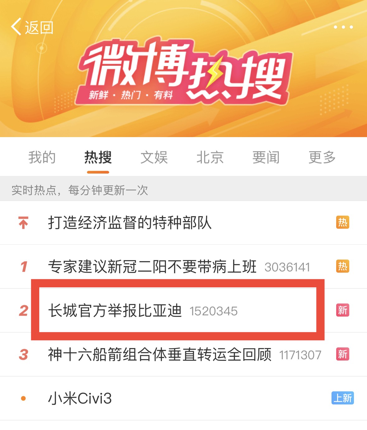 话题“长城官方举报比亚迪”一度登上微博热搜榜前三。截至发稿时,阅读量超过1亿。