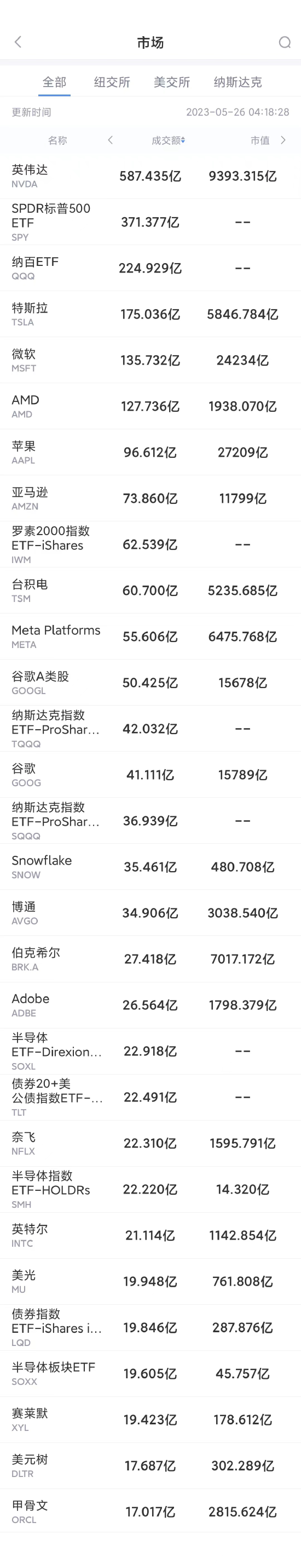 以下为美股当日交易最活跃的20只股票(按成交额):
