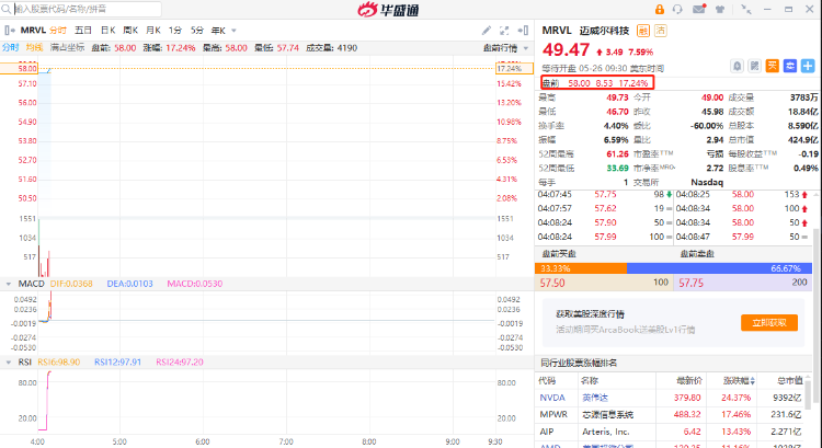 截至发稿,迈威尔科技盘前涨超17%,公司2024财年Q2营收指引好于预期,并预计2024财年人工智能营收将取得两位数的同比增幅。