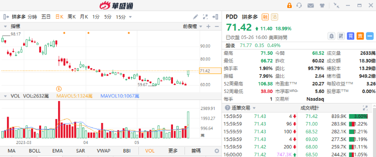 拼多多第一季度营收376.4亿元,同比增长58%,市场预期319.81亿元,上年同期237.94亿元;第一季度调整后每ADS收益6.92元,预估4.36元。一季度NON-GAAP净利101.3亿元,同比增141%。