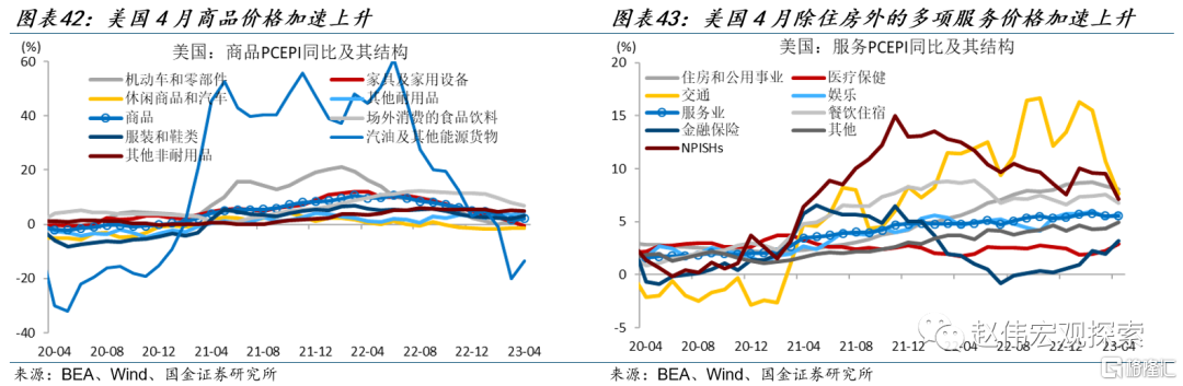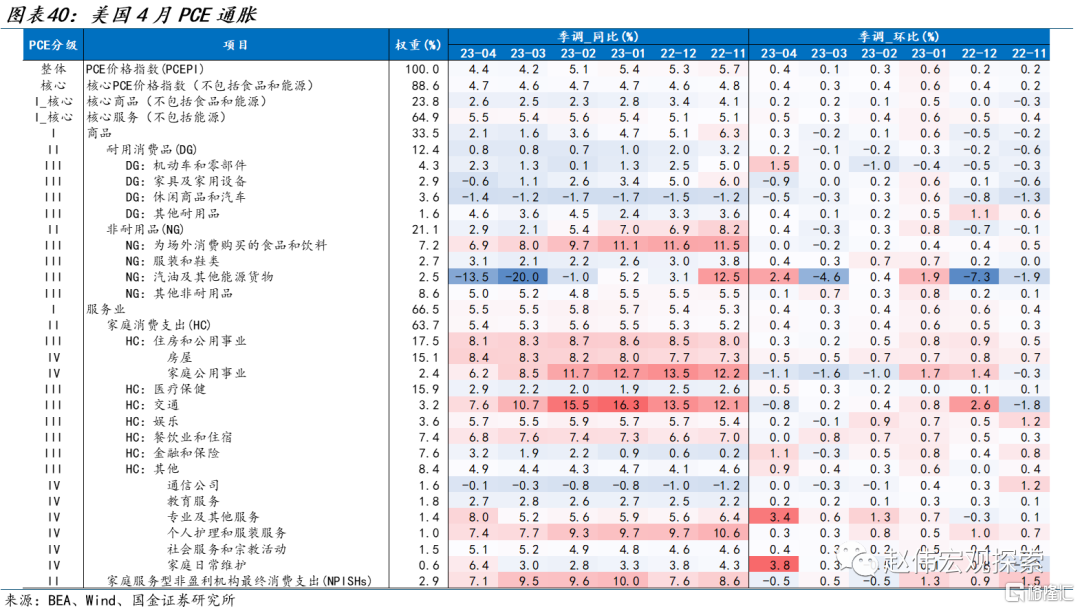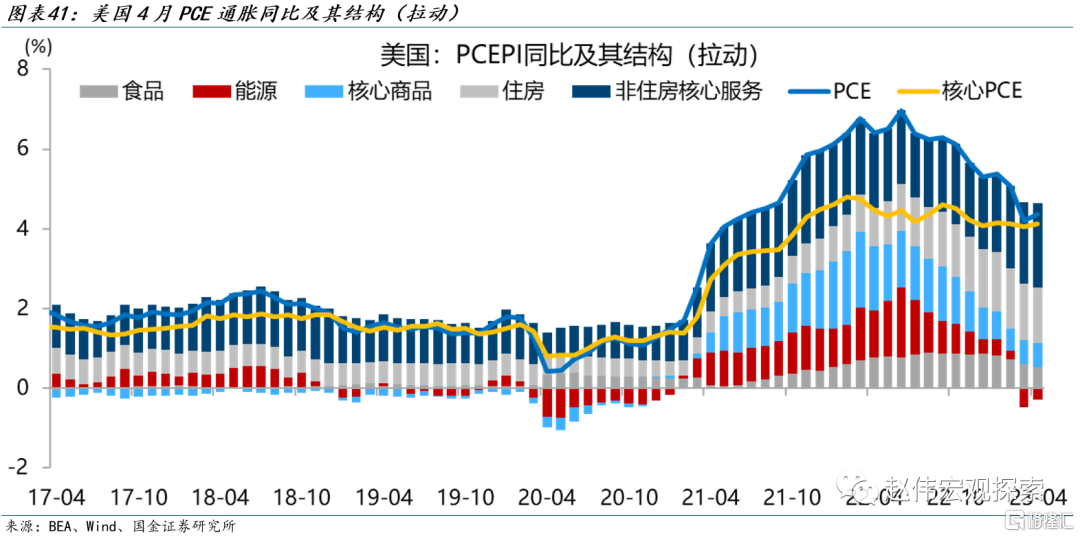 商品PCE通胀及其结构:商品价格加速上升。4月商品分项PCE物价指数同比上涨2.1%,前值1.6%。各分项中,机动车和零部件同比2.3%,前值1.3%;其他耐用品同比4.6%,前值3.6%;服装和鞋类同比3.1%,前值2.1%;汽油及其他能源货物同比-13.5%,前值-20.0%。其中,汽油及其他能源货物拉动商品PCE下降1.2个百分点(前值下降1.9个百分点)。