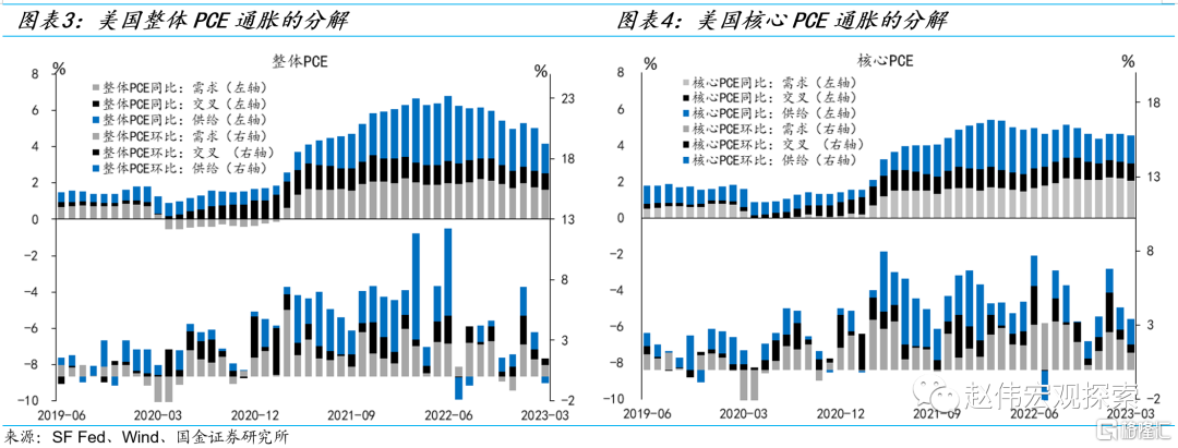 特征事实之二:供给侧修复占主导,需求收缩的贡献相对有限[1]。市场常常从物价的篮子分析通胀的结构,但它们实际上有共同的“因子”,即供给和需求。以PCE通胀为例,3月PCE通胀为4.2%,其中,供给拉动1.6%,需求拉动1.7%,交叉项为0.9%。2022年7月以来,供给侧拉动从3.6%快速下降,3月首次降至需求侧拉动以来。反观需求侧拉动,降幅则非常有限(2022年9月的高点为2.2%)。3月核心PCE通胀为4.6%,供给侧拉动1.5%,需求侧拉动2.1%,交叉项为1%。需求拉动是供给拉动的1.4倍,2022年5月的低位为0.6。