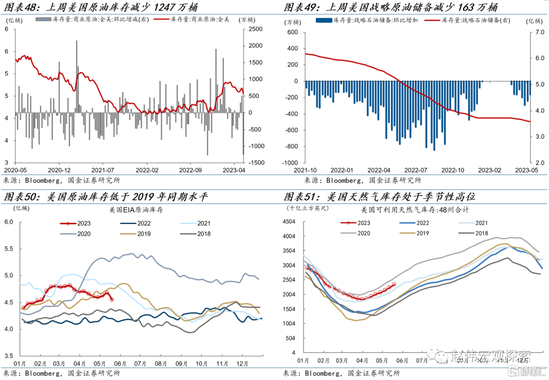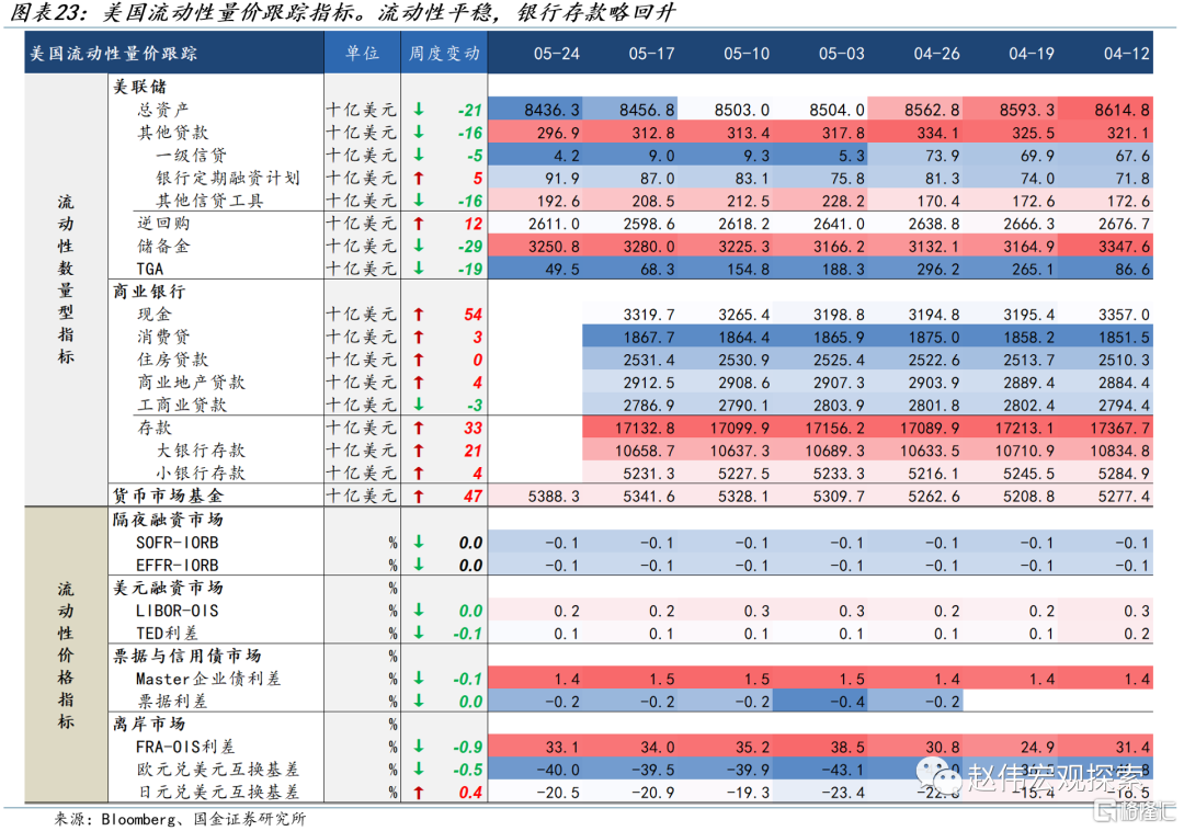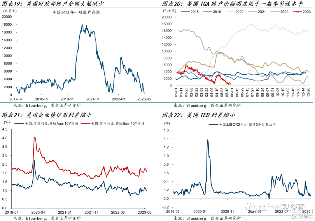 美国TGA账户余额大幅度减少,债务谈判出现进展。截至本周五(5月26日),美国两党针对债务问题的谈判仍在进行,较上周有所进展,拜登及麦卡锡表示谈判接近达成协议。另一方面,美国财政部资金余额大幅减少,截至5月26日,TGA账户余额大幅减少至495亿,明显低于季节性水平,美国主要流动性指标仍处于宽松区间。