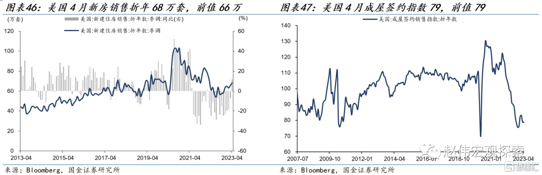 美国新房销售回升,成屋签约持平。美国4月新房销售折年68万套,前值66万套,4月环比4.1%,前值4%;美国4月成屋签约销售指数79,前值79,环比0%,前值-20%。