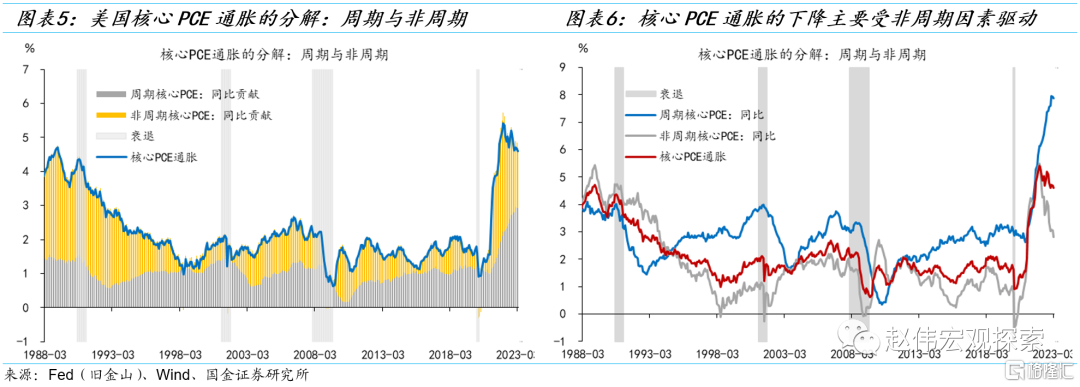 (3)非周期性(Acyclical)通胀持续下行,周期性(Cyclical)通胀持续创新高[1]。截止到2023年3月,美国核心PCE通胀的下行(几乎)全部由非周期项贡献(3月周期项开始下行)。核心PCE通胀的高点出现在2022年9月(5.2%),周期项和非周期项均拉动了2.6%。2023年3月核心PCE下降至4.6%,周期项和非周期项分别拉动了2.9%(贡献率63%)和1.7%(贡献率37%)。可见,周期项是核心PCE通胀下行的主要拖累。从周期项的构建方法可知,其下行阶段的开启往往以失业缺口的下降为前提,这也是NBER衰退阶段的典型特征。