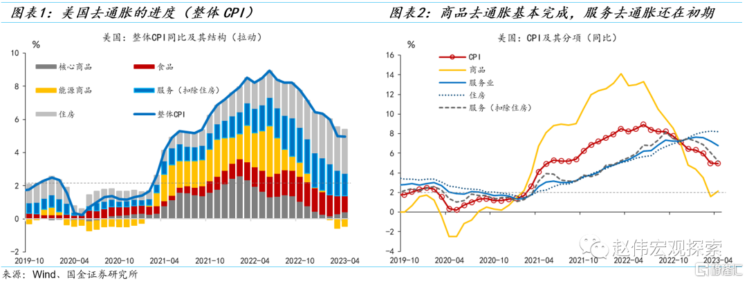 美国去通胀“上半场”的特征事实之一:整体CPI通胀下行斜率较陡,结构上以商品去通胀为主,服务去通胀为辅,前者已基本完成,后者还处于早期。商品CPI通胀已经从2022年3月的高点(14.11%)下降到2023年3月的1.6%(4月反弹至2.2%)。故可以说,商品去通胀已经完成,下一阶段的任务是防范商品的“二次通胀”风险。