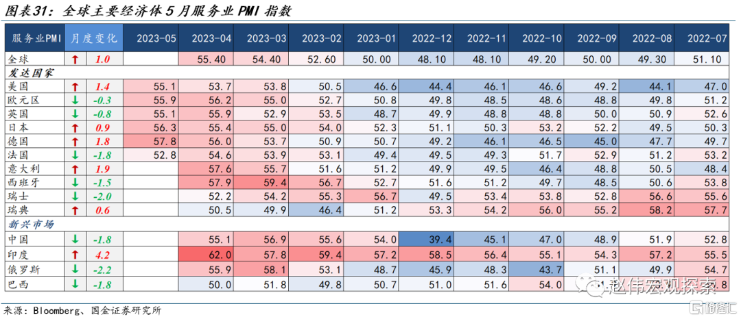 欧美制造业PMI回落,美国制造业PMI重回收缩区间。欧元区5月制造业PMI录得45,前值46;英国降至47,前值48;德国降至43,前值45;美国5月制造业PMI录得48.5,前值50.4。欧美服务业PMI分化,欧洲服务业回落,美国上行。欧元区、英国、法国5月服务业PMI分别下行至56、55及53,美国服务业PMI升至55.1,前值53.7。