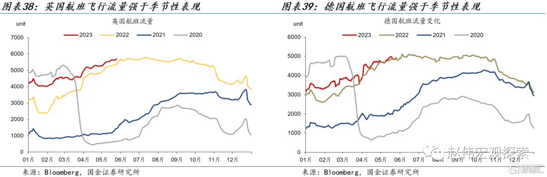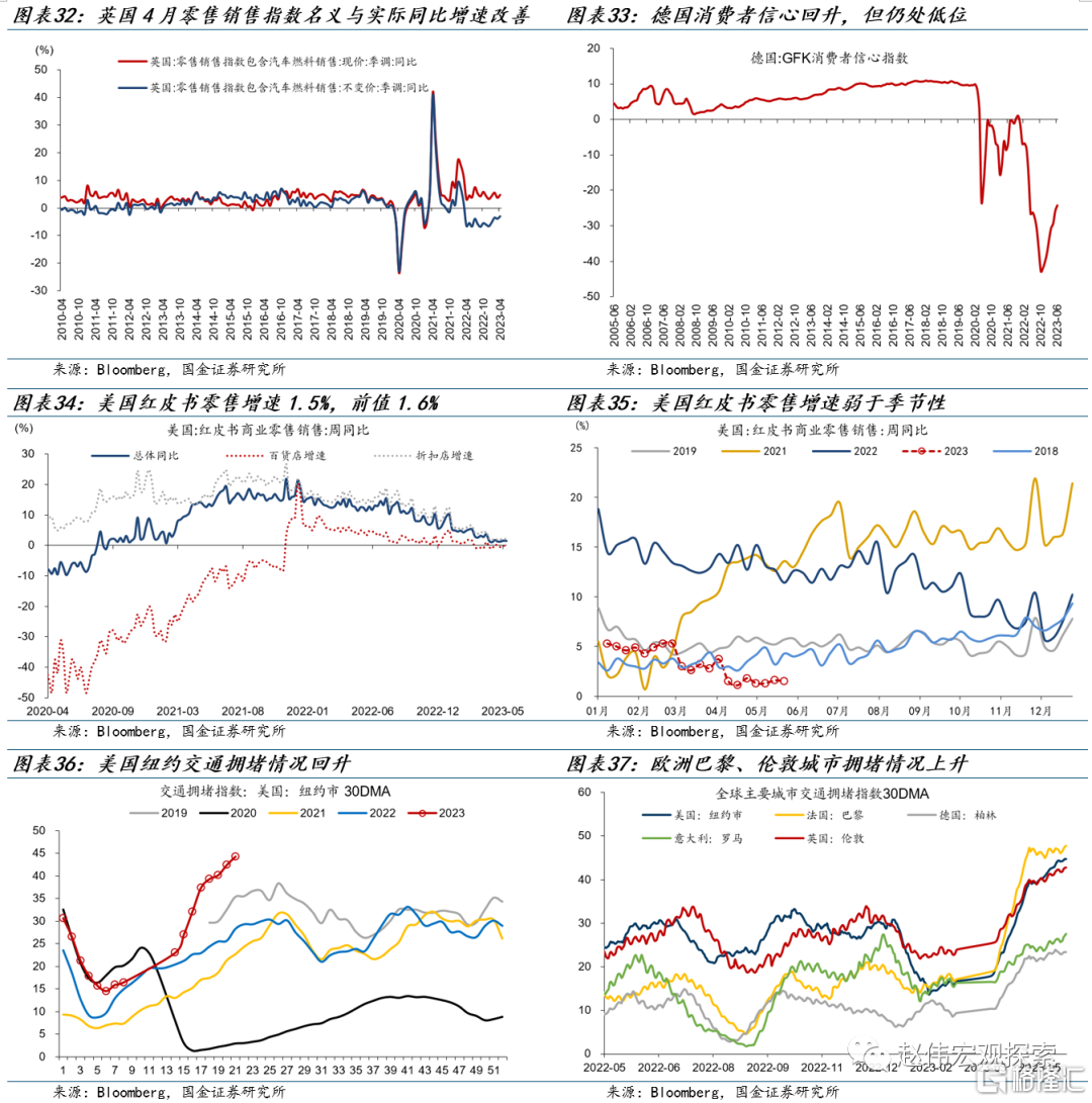英国零售增速上升,德国消费者信心回升,但仍处低位。英国4月零售销售指数名义同比4.7%,前值3.7%;实际同比-3%,前值-3.9%。德国6月GFK消费者信心-24,前值-26。5月20日当周,美国红皮书零售增速1.5%,前值1.6%。欧美航班出行情况延续回升,纽约拥堵指数延续上升。