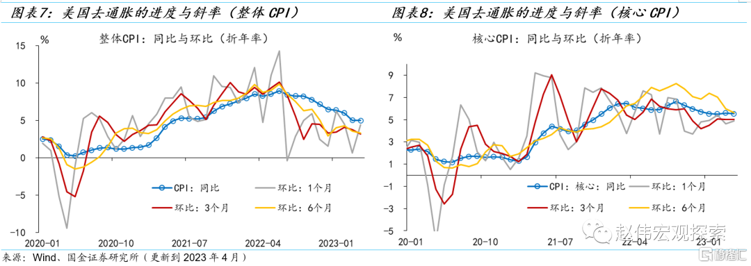 时至2023年中,美国去通胀的斜率趋于平坦化。虽然CPI同比延续下行态势,但环比却开始走平,甚至有所反弹。年初以来,CPI的3个月和6个月环比分别从3.3%和2.9%反弹至4.1%和4.3%。核心CPI同比开始走平,6个月环比持续高于同比,1个月和3个月环比分别从3.7%和4.2%反弹至5.4%和5.1%。