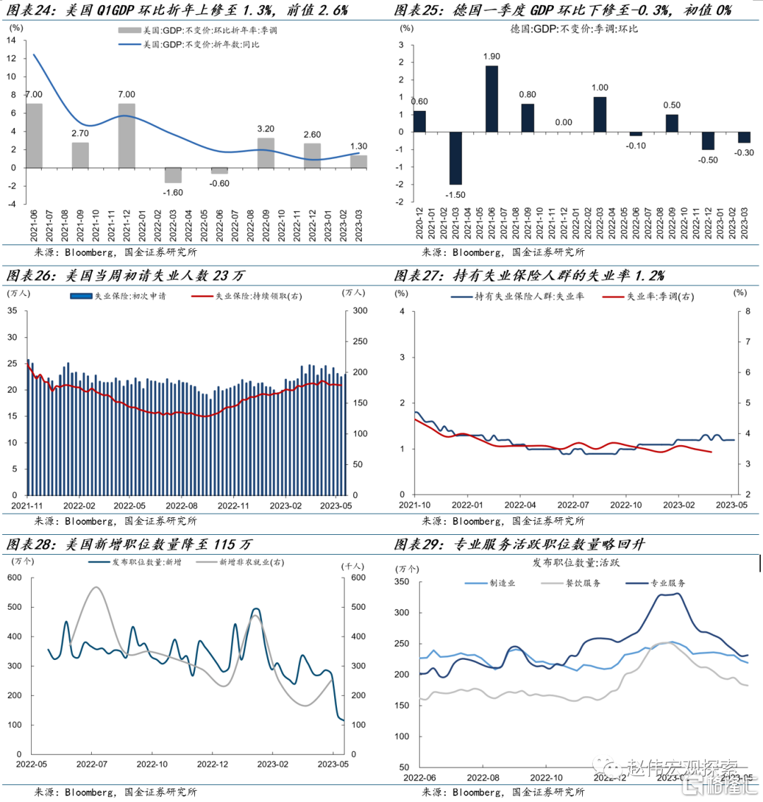 美国一季度GDP上修,德国GDP环比下修。美国一季度GDP环比折年终值上修至1.3%,初值1.1%,上修0.2个点,前值2.6%;德国一季度GDP环比下修至-0.3%,初值0%,前值-0.5%,连续两季度环比为负。美国当周初请失业人数23万人,前值23万;持有失业保险人群的失业率1.2%,美国5月15日当周新增职位数量降至115万,前值132万,其中专业服务活跃职位数量略回升。