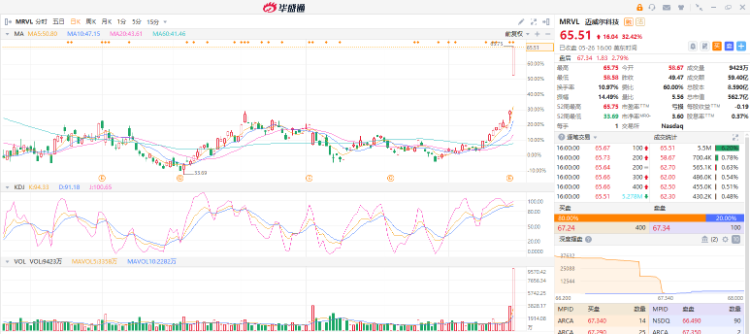上周五费城半导体指数收涨6.81%,美国芯片制造商迈威尔科技( $MRVL )在周四盘后发布的财报中提到“预期2024年业绩翻一番,2025年再翻一番”。受此消息影响,迈威尔科技周五收涨32.42%,市值飙升近140亿美元。其他股方面,英伟达( $NVDA )涨逾2%,美国超微公司( $AMD )涨逾5%。