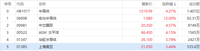 5月29日消息,港股半导体板块拉升走高。截至发稿,宏光半导体涨超12%,中芯国际、ASM太平洋涨超4%,华虹半导体、上海复旦涨超3%。