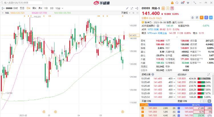 消息面上,网易公布一季度业绩显示,净收入同比增长6.3%至250亿元人民币,超过市场预期的248亿元;非公认会计准则下归属于公司股东的净利润76亿元,超过市场预期的57亿元。
