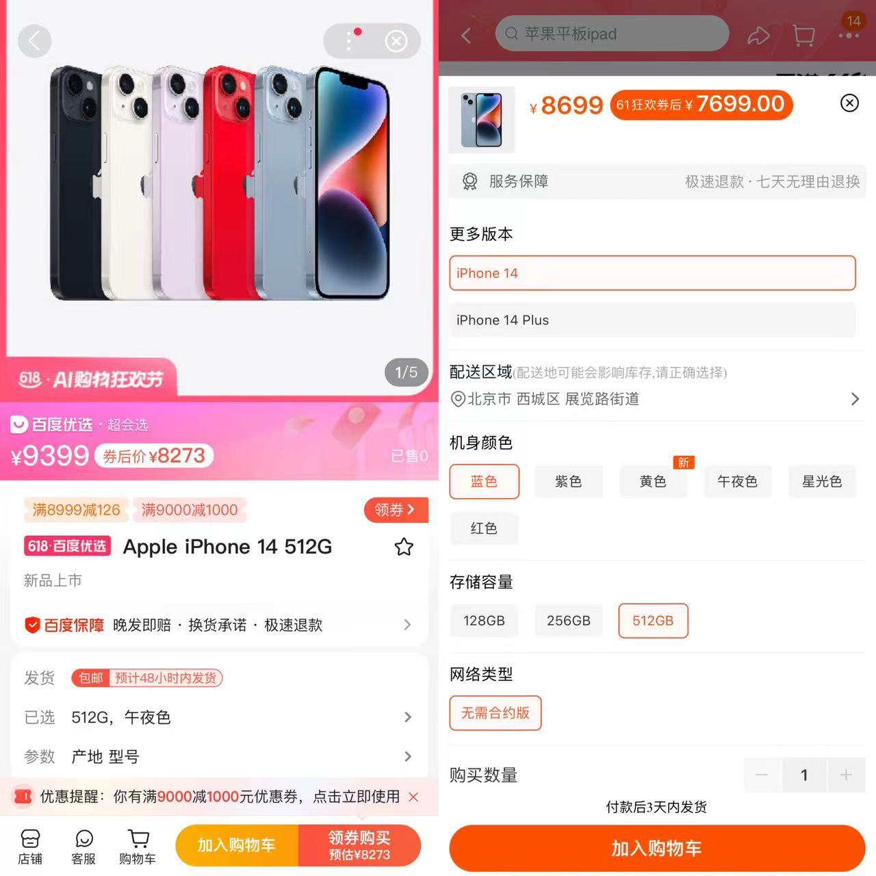 左图:百度优选iPhone 14 512G券后价格为8273元;右图:淘宝iPhone 14 512G券后价格为7699元。图源:作者搜索截图
