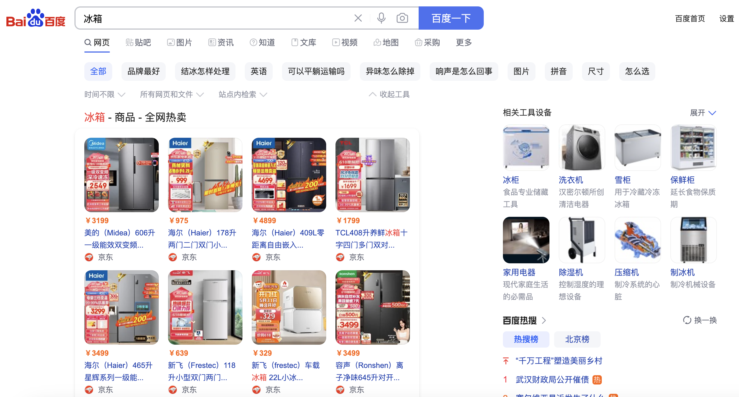 在百度搜索冰箱,首页会推送京东的购买链接。图源:作者搜索截图