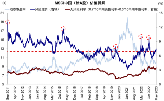 此外,当前风险溢价已经处于高位,MSCI中国指数(除A股)12个月动态市盈率目前为9.2倍,扣除3.5%无风险利率后(0.7*十年期美债利率+0.3*十年期中债利率),风险溢价已经接近7.5%,为自去年10月底以来新高(10%)。