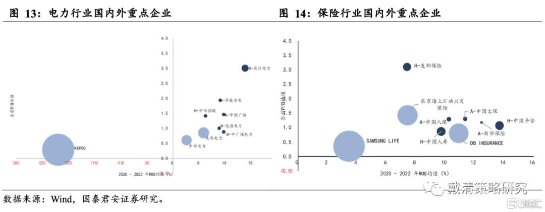全球市场行业龙头对比,港股性价比高的行业包括银行、建筑、电力、保险等共13个行业。我们通过对比港股、A股和海外行业龙头的PB/ROE,尝试寻找当下性价比高,行业景气度可能变化的公司。以Wind二级行业分类,港股PB/ROE比值明显低于A股和海外的行业及个股包括:银行业(建行、工行、中国银行、农业银行比值均为0.04);建筑行业(中国铁建0.03、中国中铁0.05);电力行业(中广核电力0.15);保险行业(中国平安0.08);技术硬件与设备行业(联想集团0.06);家庭用品行业(恒安国际、巨子生物比值均为0.11);医疗保健行业(上海医药0.08);制药行业(药明康德0.28);消费者服务行业(中国中免0.22);零售业(阿里巴巴0.15);材料行业(海螺水泥0.03);资本货物行业(中信股份0.04);商业服务行业(海螺创业0.02、光大环境0.03)。