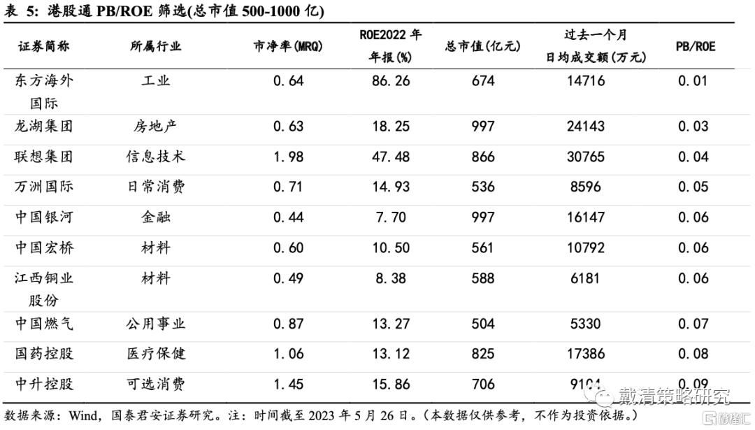 港股通所有标的中满足PB/ROE筛选条件的个股共74只。针对港股通共561只个股,我们通过以下条件筛选出性价比高,可能有景气好转机会的公司。1)高市值:总市值大于1000亿、500-1000亿和100-500亿;2)性价比高:PB/ROE比值小于0.1;3)高流动性:过去一个月日均成交额大于5000万。满足筛选条件的个股共74只,其中市值大于1000亿的共43只,市值在500-1000亿之间的共10只,市值在100-500亿之间的共21只。