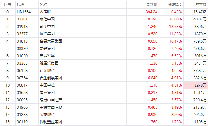 华盛资讯5月30日消息,午后港股部分内房股上涨,其中,融创中国涨超12%,远洋集团涨超11%,合景泰富集团涨超10%,新城发展涨超6%,中国金茂涨超4%,保利置业集团涨超1%。