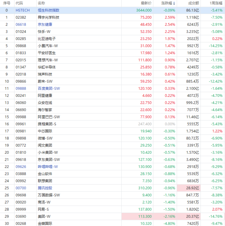 科技股走势分化,舜宇光学科技、京东健康、快手-W涨超2%,比亚迪电子、平安好医生涨超1%,华虹半导体跟涨。腾讯控股,哔哩哔哩-W小幅下跌,美团-W跌超1%。