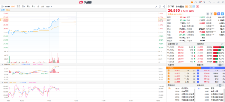 5月30日,东方甄选( $01797.HK )早盘再涨超5%,截至发稿,报26.95港元,成交额2.36亿港元。
