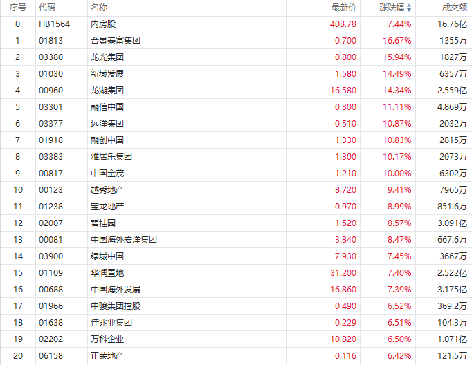 6月2日,内房股午后多数走强,截至发稿,龙光集团涨超15%,新城发展、龙湖集团涨超14%,远洋集团、中国金茂涨超10%,越秀地产涨超9%,中国海外发展涨超7%,新世界发展,信和置业涨超5%。