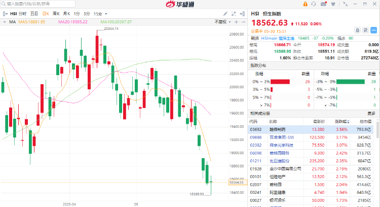 美国就提高债务上限达成初步协议,不过未见对港股带来支持,恒指连日下试低位,截至发稿,回稳守18500点,报18562.63.
