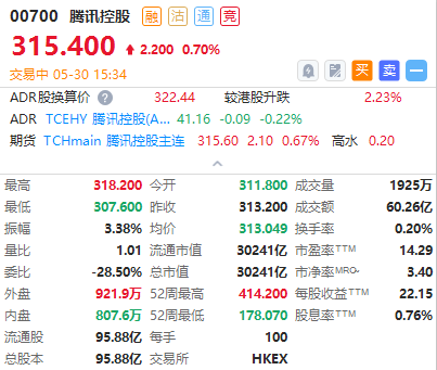 腾讯( $00700.HK )周一捱沽,低位曾跌逾3%至311.2港元,曾经失守200天线,逐步下试今年以来低位,短线观望能否在200天线附近止跌。现报315.4港元每股。