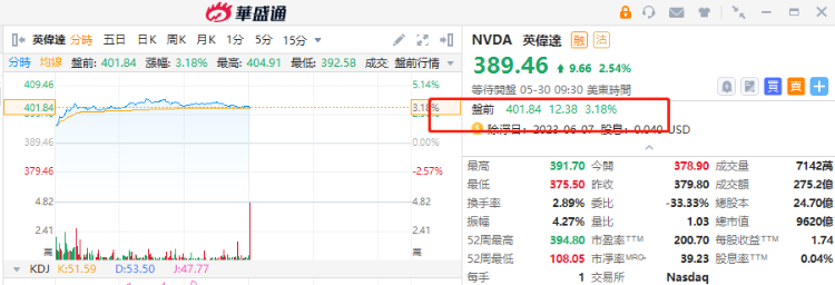 英伟达盘前涨幅扩大至近5%,市值突破万亿美元;三大期指盘前涨跌不一,截至发稿,道指期货 $YMmain 微跌0.03%,纳指期货 $NQmain 大涨1.32%,标普500指数期货 $ESmain 涨0.56%。
