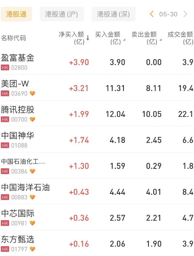 南下资金今日净买入港股14.03亿港元。盈富基金、美团-W、腾讯控股分别获净买入3.9亿港元、3.21亿港元、1.99亿港元。