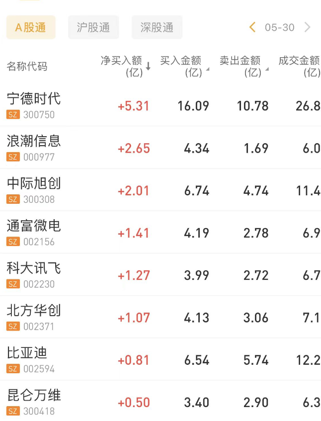北向资金今日净买入6.49亿元。宁德时代、浪潮信息、中际旭创分别获净买入5.31亿元、2.65亿元、2.01亿元。贵州茅台净卖出额居首,金额为9.08亿元。