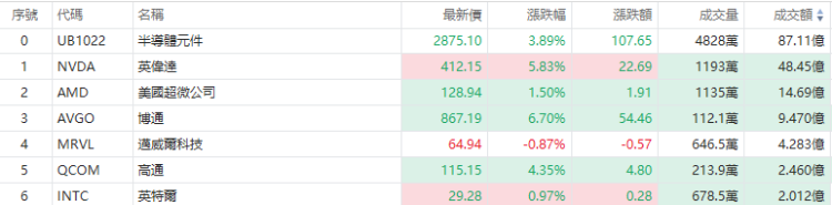 盘面上,半导体板块多数走高,英伟达飙涨近6%成为第九家市值突破万亿美元的公司,博通、高通涨约5%,英特尔涨超2%,AMD涨超1%。