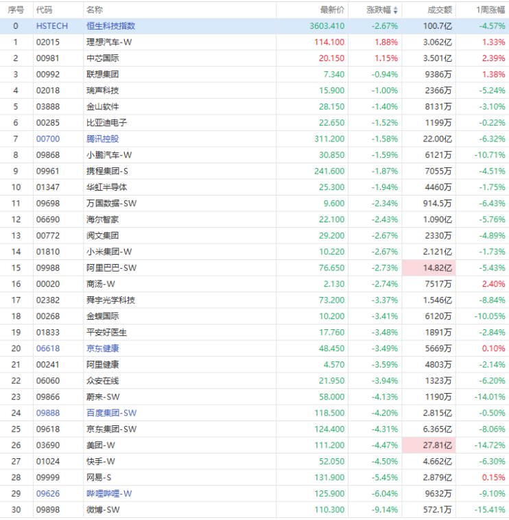 科技股多数走低,中芯国际、理想汽车涨超1%,联想集团跌近1%,金山软件、腾讯控股,华虹半导体,携程集团-S跌超1%,小米集团-W、比亚迪电子、阿里巴巴-SW跌超2%,京东健康、阿里健康跌超3%;网易-S跌超5%,哔哩哔哩-W跌超6%。