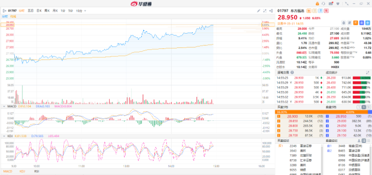 华盛资讯5月31日消息,东方甄选( $01797.HK )午后再涨超6%,本周累涨逾21%。截至发稿,涨6.64%,报28.95港元,成交额5.1亿港元。