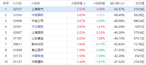 截至发稿,上海电气A股涨7.57%,H股现涨2.58%;中芯国际A股涨2.85%,H股现涨1.41%;中国电信A股涨1.5%,H股现跌1.9%。