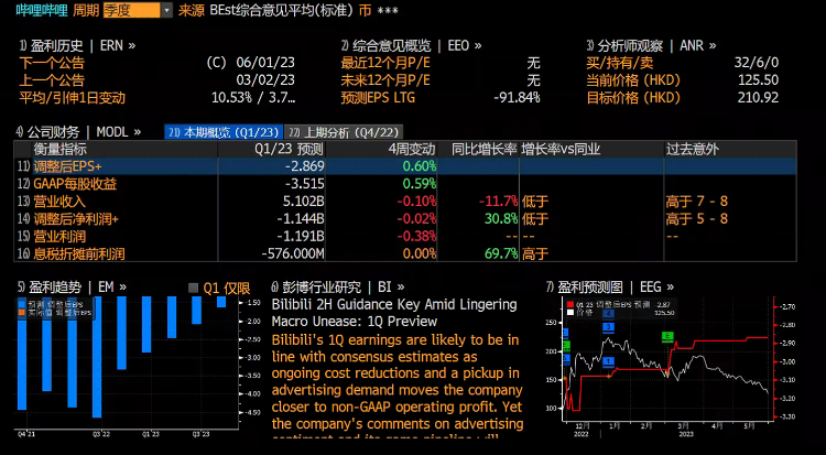 据彭博分析师预期,哔哩哔哩2023年第一季度营业收入约为51.02亿人民币;调整后净亏损11.44亿人民币,每股亏损3.515元。近期共有32位分析师给出“买入”评级,平均目标价210.92港元。