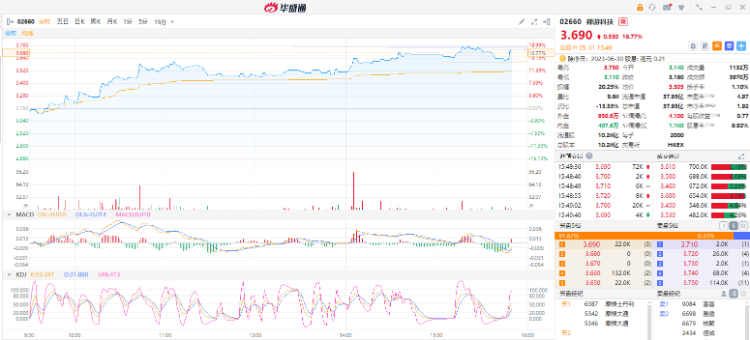 华盛资讯5月31日消息,禅游科技( $02660.HK )涨幅扩大至超16%,报3.69港元创逾2个月新高价,成交额明显放大至3970万港元,总市值37.95亿港元。